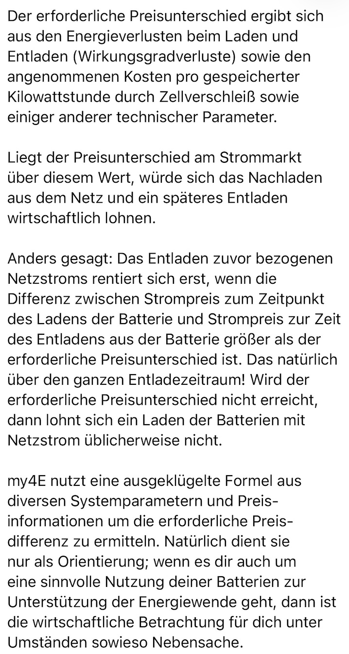 Aus diesen Werten berechnet my4E den sogenannten erforderlichen Preisunterschied (Δmin) – also die Schwelle, ab der sich das gezielte Nachladen aus dem Netz tatsächlich rechnet. So kannst du künftig auf einen Blick erkennen, ob sich das Zwischenspeichern von günstigem Strom lohnt, um ihn später zu Zeiten höherer Strompreise wieder zu nutzen.