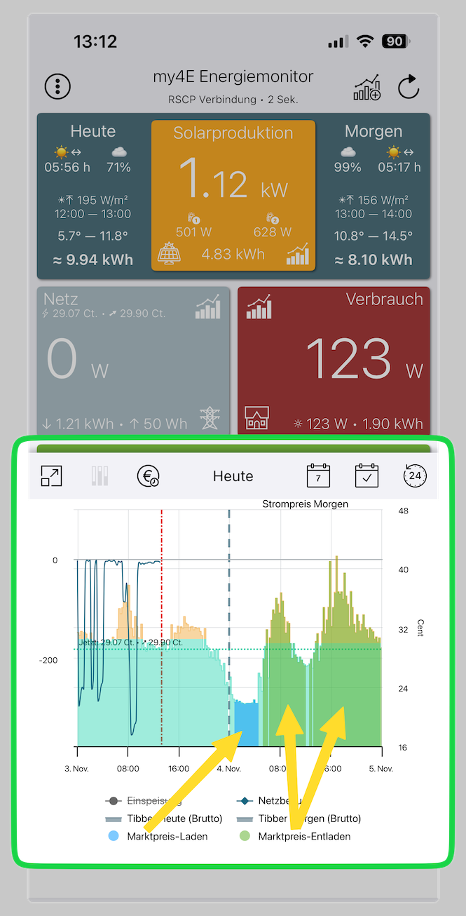 Wenn der Preisunterschied zwischen günstigen und teuren Stunden groß genug ist, zeigt my4E an, dass das Nachladen wirtschaftlich sinnvoll ist. Sowohl in Textform (langes Halten der 'Netz'-Kachel), oder auch im Börsenstrompreis-Diagramm (Hauptmenü), oder im Diagramm der 'Netz'-Kachel >>> Diagramm für Heute.
